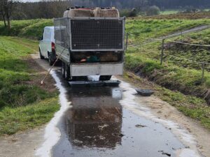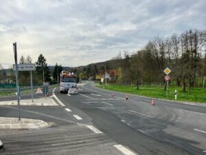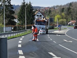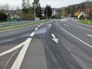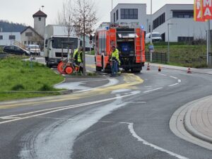 Aufgrund der starken Verschmutzung musste die ST 2308 halbseitig gesperrt werden. Mit Hilfe eines Spiezialfahrzeugs der Firma Wuest GmbH konnte anschließlich die Straße gereinigt werden.